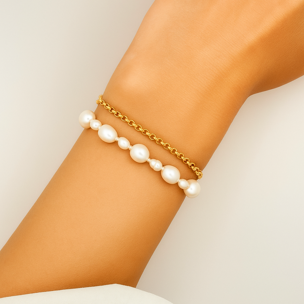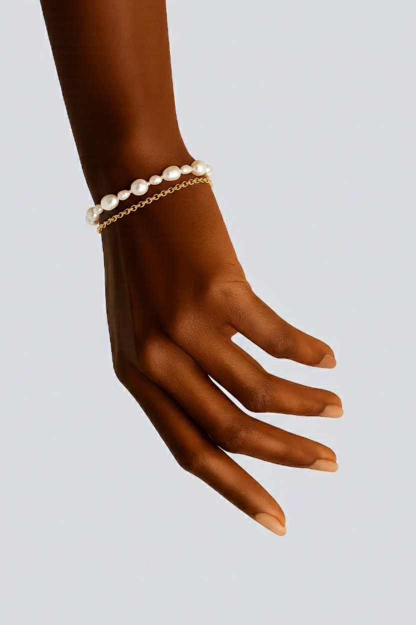 A double chain design paired with luminous baroque pearls, this bracelet blends bold structure with delicate beauty. Thoughtfully crafted for comfort, it’s perfect for daily wear. A graceful expression of balance, celebrating both your strength and softness.