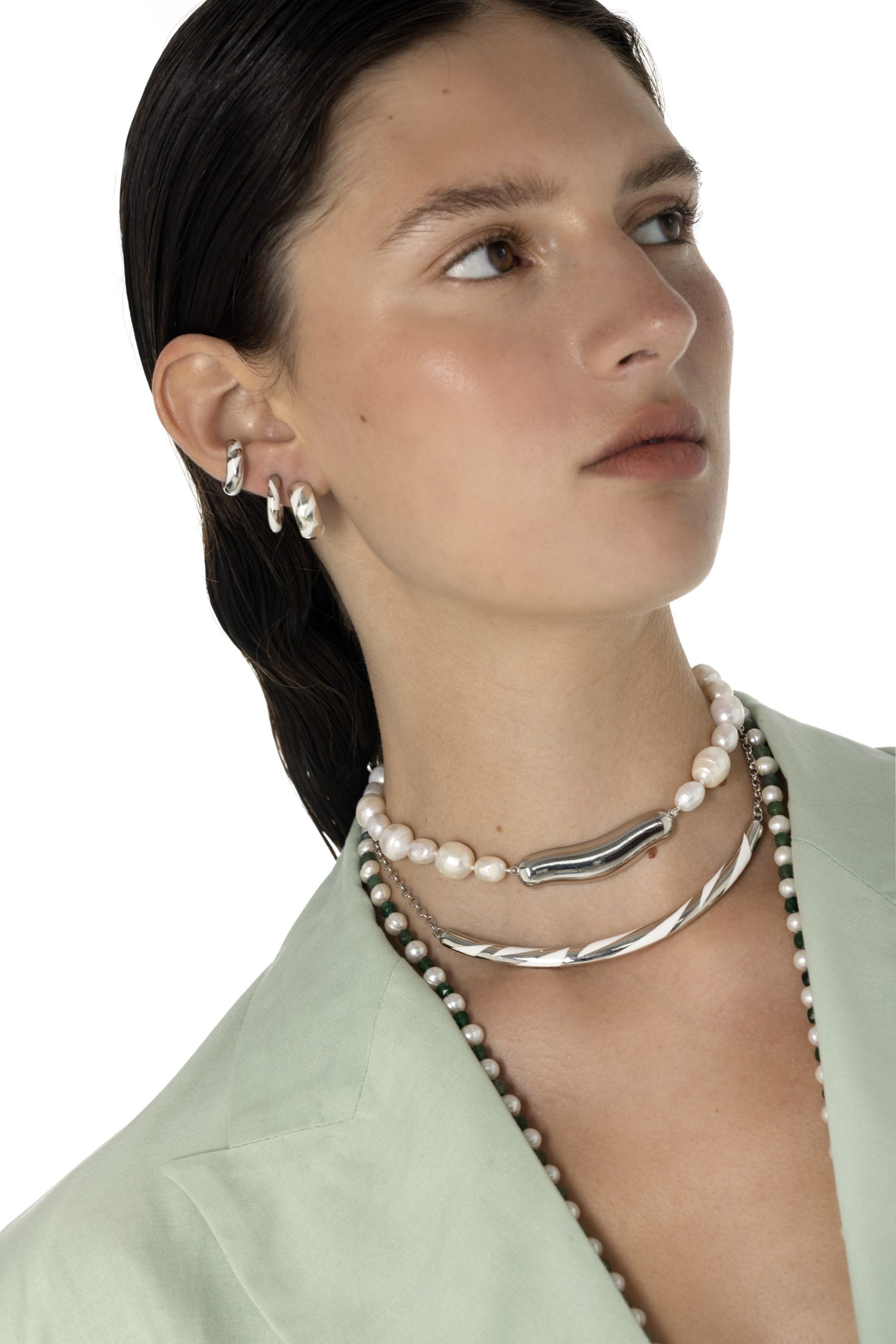 A sleek cuff with bold, fluid lines – designed to reflect light with every movement. Lightweight and comfortable, this piece can we warn solo or layerd. A timeless piece that captures the quiet strength of natural form.