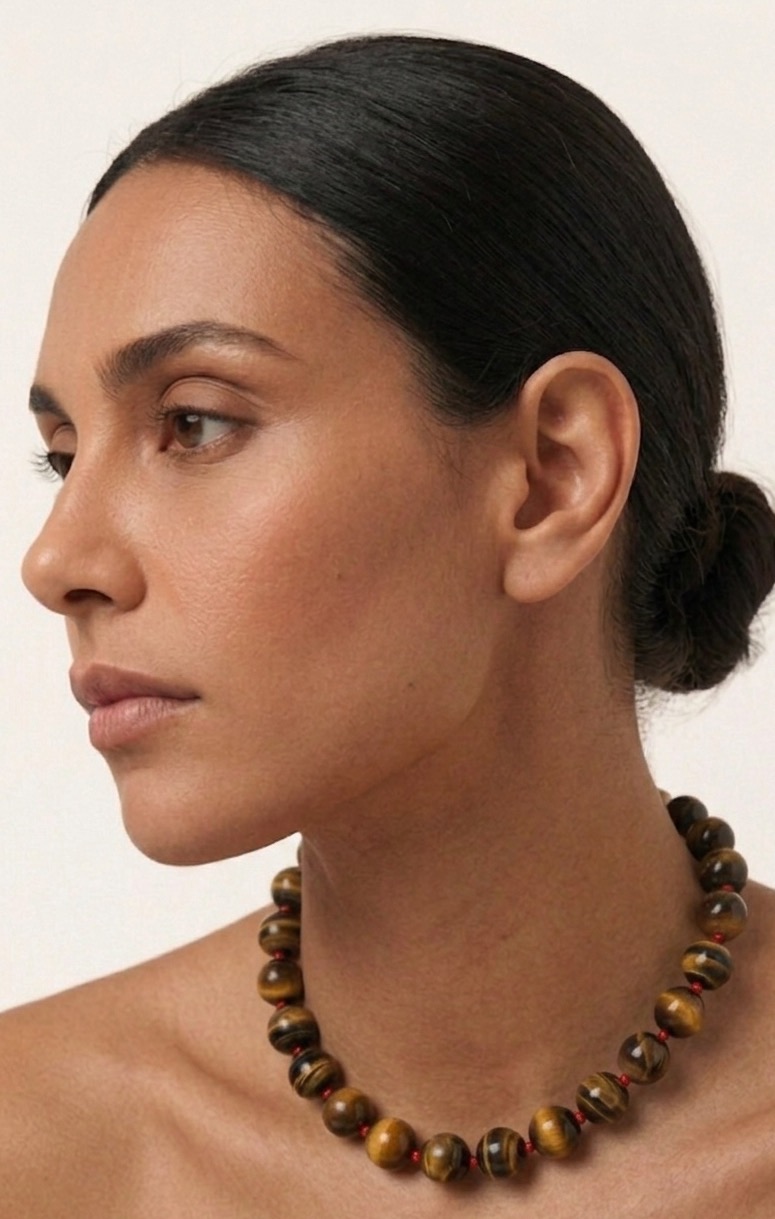 Golden-brown tiger’s-eye rests close to the heart, pulsing with warm, earthy energy. A subtle power piece that grounds any outfit with effortless cool and a hint of fire.